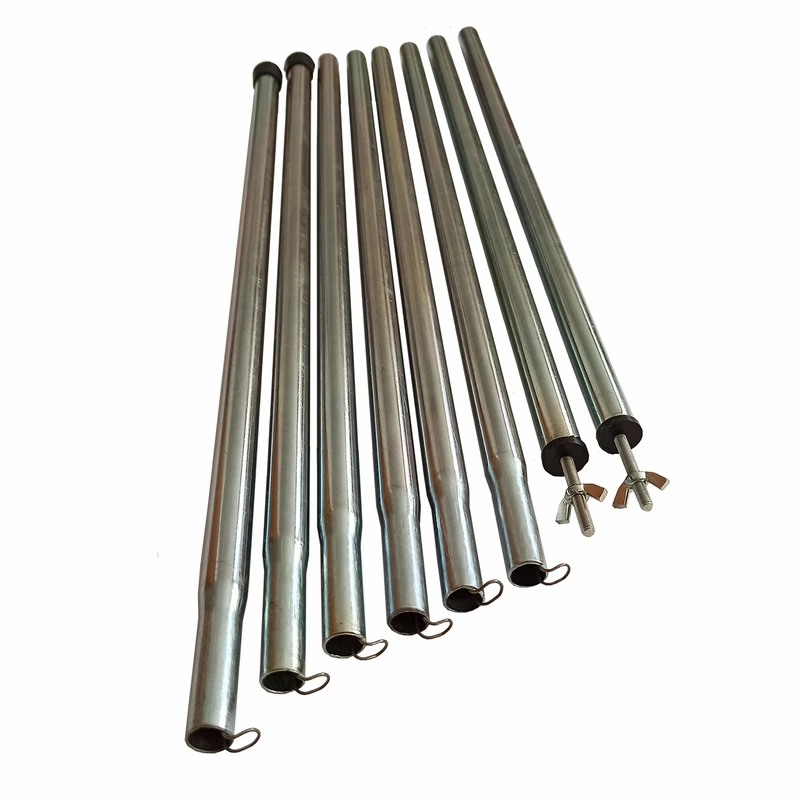 ۸ لوله ۵۰ سانتیمتری ۲ عدد طناب و تنظیمکننده قابلیت اتصال لولهها با استفاده از فنر اصطکاکی سرستونها به صورت پیچ و مهره است. دارای پوشش مقاوم در برابر زنگزدگی با استفاده از روش گالوانیزه الکتریکی و به رنگ نقرهای قابلیت تنظیم ارتفاعهای مختلف دارای کاور حمل جنس کاور حمل از پارچه آکسفورد مناسب برای انواع چادر، سایبان