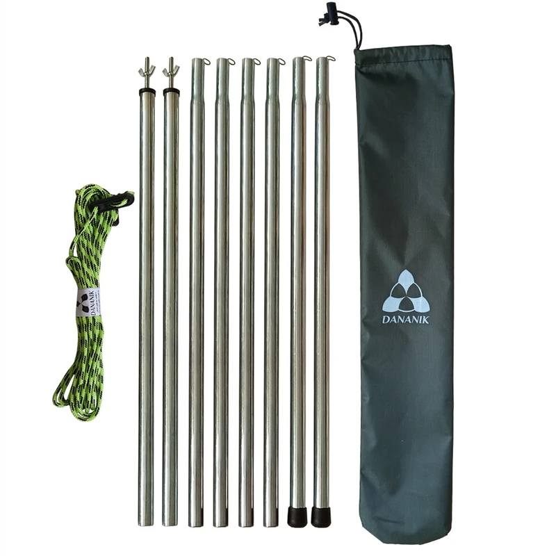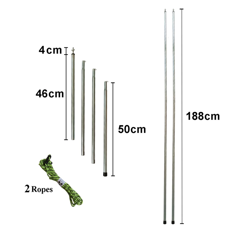 جهت برپایی انوع سایبان و چادر، ستون یکی از ملزومات اصلی محسوب میشود. این محصول از 8 لوله آهنی با پوشش به روش گالوانیزه الکتریکی به رنگ نقرهای تشکیل شده است که با استفاده از فنرهای اصطحکاکی به یکدیگر متصل میشود. بدین ترتیب دو ستون به ارتفاع 188cm را تشکیل میدهد که در ارتفاعهای مختلف قابل نصب است. همچنین دو عدد طناب به همراه تنظیمکننده نیز در بستهبندی قرار داده شده است.