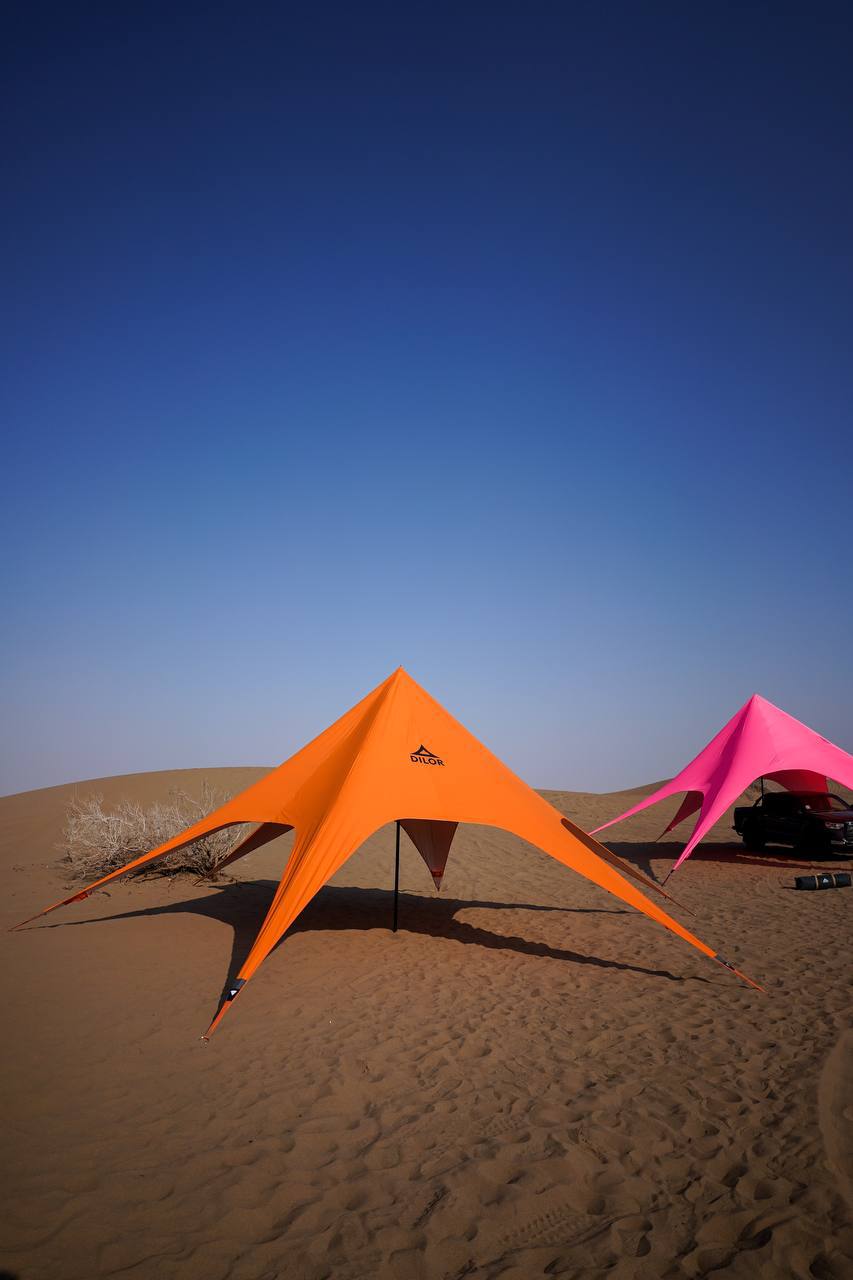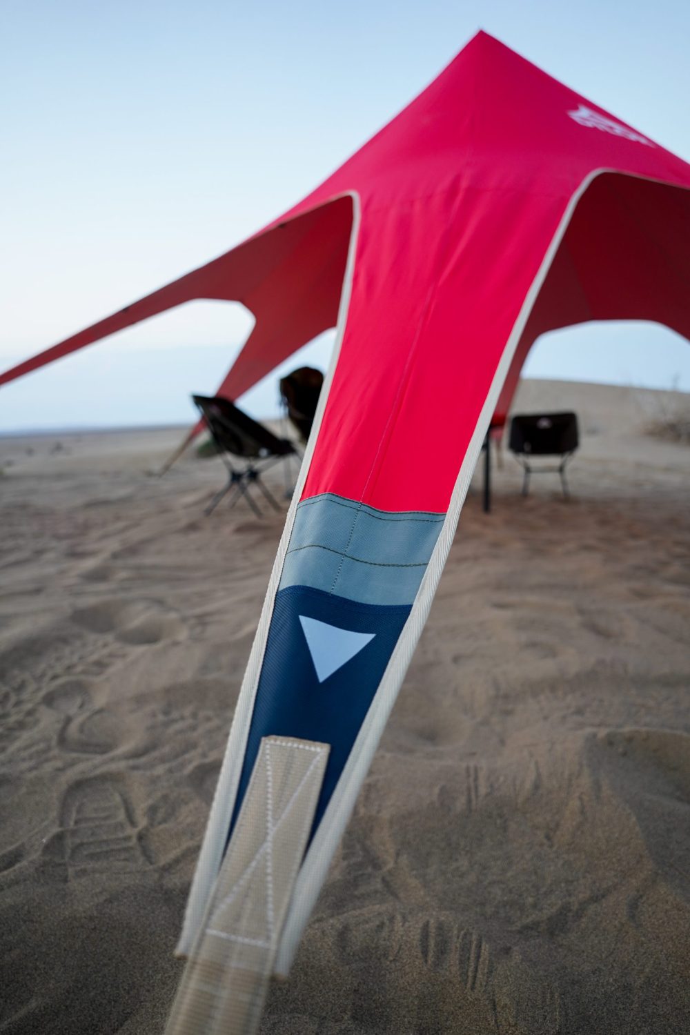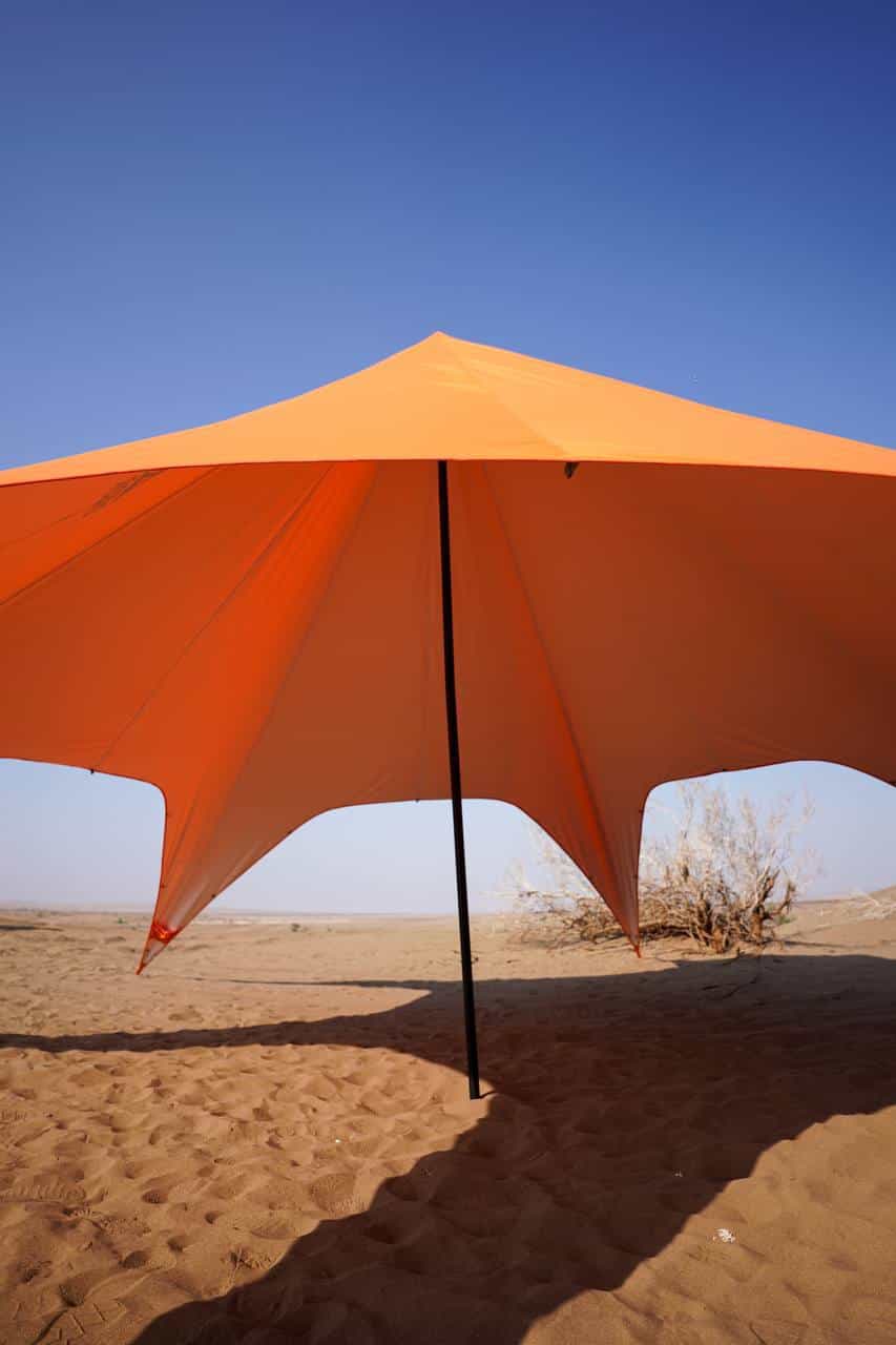 جنس پارچه از آکسفورد سه لایه بسیار مقاوم است همچنین دوخت ان در مقابل کشش های ناشی از جریان باد و بارش باران مقاومت بالایی دارد. طراحی این سایبان به نحوی بوده تا بتواند بیشترین مساحت سایه را ایجاد کند، همچنین ارتفاع قسمتهای هلالی ان بلند درنظر گرفته شده تا علاوه بر گردش ازاد هوا، رفت و امد افراد زیر ان به راحتی میسر باشد، همچنین بتوان زیر ان چندین میز و صندلی برای گروه های پر جمعیت قرار داد.یا چندین چادر در زیر ان بنا کرد همچنین قابلیت ورود خودرو به زیر سایبان هم وجود دارد، تا در مقابل بارشهای ناگهانی و تابش مستقیم نور آفتاب در امان باشید.. در طراحی این محصول قسمتهایی بصورت جیب برای نگه داری از لوازم کوچک مانند گوشی موباید یا پاور بانک در نظر گرفته شده، ودر قسمت هلالی تسمه هایی برای نصب ریسه دوخته شده که میتوان با نصب لامپ ریسه ای محیطی رویایی را در تاریکی شب ایجاد کرد.